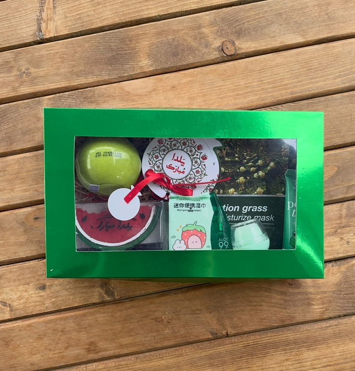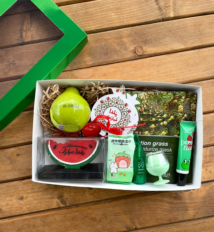 جعبه پوشال فال یلدا کرم دست ماسک صورت بالم لب شمع یلدادستمال مرطوب